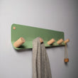 Elevate your home organisation with this sleek and modern wall-mounted coat rack. The minimalist design features a smooth sage green metal backplate complemented by five natural wooden pegs that add a touch of warmth to any space. Each cylindrical peg is expertly crafted from solid wood, offering sturdy support for coats, scarves, bags, and other accessories. The angled design of the pegs prevents items from slipping while maintaining an aesthetically pleasing appearance. Perfect for entryways, mudrooms, or bedrooms, this versatile rack combines functionality with contemporary style. The durable metal construction ensures long-lasting performance, while the clean lines and sophisticated colour palette blend seamlessly with various interior décor styles. Installation is straightforward with the included mounting hardware.