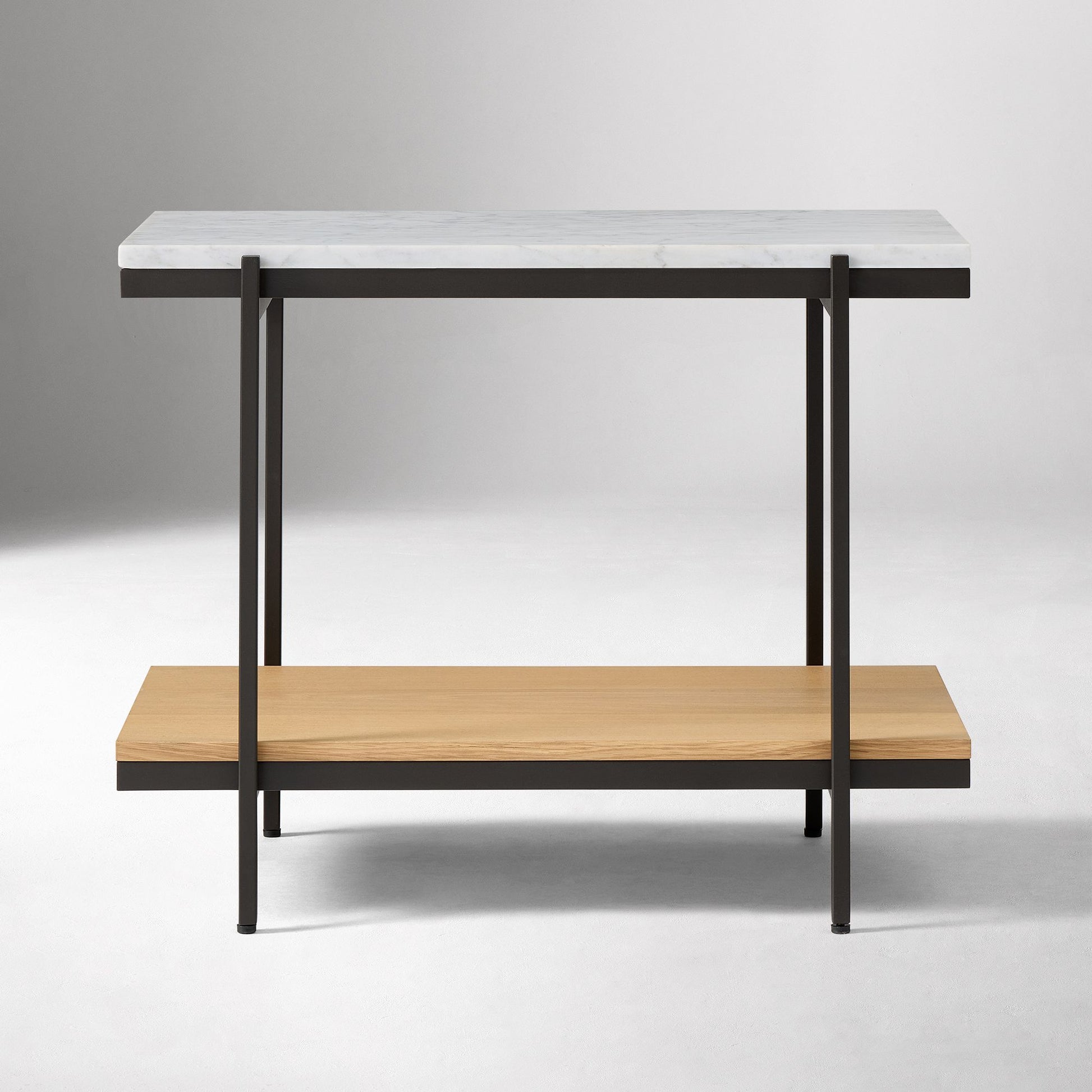 The table is framed in durable black powder-coated steel, giving it a bold architectural presence with clean lines and industrial appeal. Beneath the marble top, a natural wood shelf provides additional storage or display space, ideal for stacking books, showcasing curated accessories, or keeping daily essentials within easy reach.